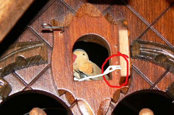 Here (pictured below) is a view from behind the cuckoo bird where you can see the connecting wire that has become unattached from the door. I've circled this push wire in red:
